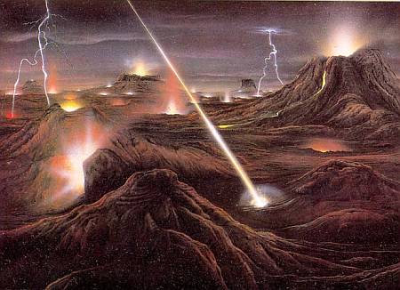 Из тысяч вулканов, расщелин и трещин начали вырываться газы, образовавшие первую атмосферу. В ее составе вместе с другими веществами был и водяной пар. Температура постепенно понижалась, и из огромных облаков вода обрушивалась на еще не остывшую поверхность, чтобы тут же испариться на ней, как на горячей плите. Охлаждение Земли продолжалось, и позднее образовались первые, еще горячие океаны. Их температура тоже понижалась очень медленно. Земной ландшафт постоянно освещался Солнцем. Поэтому охлаждение планеты наконец прекратилось, а в морях зародились первые живые организмы.