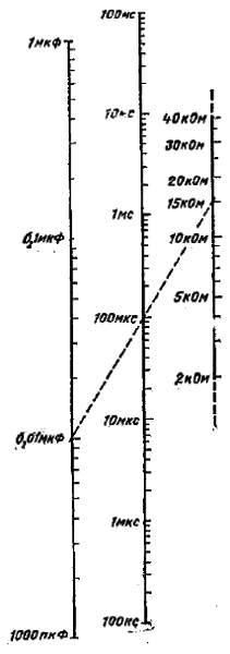 Рис. 3.7. Номограмма для расчета длительности импульса в микросхеме 74121. При С = 0,01 мкФ и R = 15 кОм длительность импульса составляет 100 мкс.