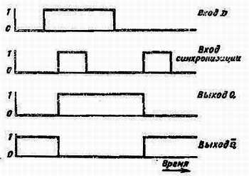 Как видно из диаграммы, состояние входа D передается на выход Q по нарастающему фронту сигнала синхронизации. Спадающий фронт сигнала синхронизации не оказывает воздействия на выход Q. Отметим, что обычные D-триггеры, например 7474, 74174 и 74175, синхронизируются нарастающим фронтом CLOCK, а JK-триггеры — спадающим фронтом.