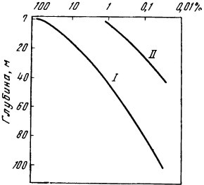 Рис. 43. Ослабление с глубиной нисходящего I и восходящего II световых потоков в Тихом океане (% от падающего на поверхность)
