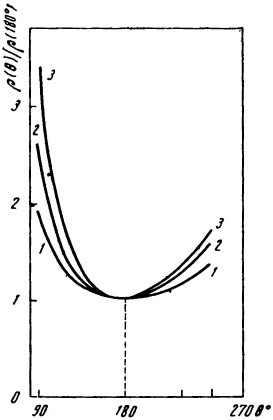 Построить эту кривую можно следующим образом. В данной точке поверхности моря измеряют яркость выходящего излучения в различных направлениях, т. е. под разными углами к вертикали. Угол наблюдения ? отсчитывается от вертикальной оси, направленной вниз. Угол 180° соответствует наблюдению строго вертикально — в надир, углы 90° и 270° — лучам, скользящим по поверхности моря. Полученные значения яркости ?(?) делят обычно на значение яркости под углом 180°—?(180°), т. е. ордината угла 180° равна единице.