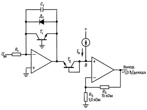 Источник тока (роль которого может выполнять резистор, так как потенциал точки В отличается от потенциала земли на несколько десятых долей вольта) задает входной ток, служащий для установки выходного напряжения на нуль. Второй операционный усилитель является неинвертирующим, его коэффициент усиления по напряжению должен быть равен приблизительно 16, для того чтобы напряжение на выходе изменялось в отношении — 1,0 В на декаду входного тока (напомним, что напряжение Uбэ увеличивается в отношении 60 мВ на декаду коллекторного тока).