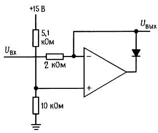 Упражнение 4.9. Объясните, как работает схема, показанная на рис. 4.45. Подсказка: сначала на вход нужно подать положительное напряжение и посмотреть, что будет, а затем — отрицательное напряжение.