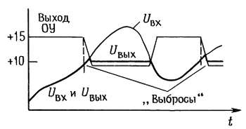 Для показанных на схеме величин компонентов напряжение на входе, отвечающее условию Uвх < +10 В, приводит выход ОУ в состояние насыщения, и выполняется условие Uвых = Uвх. Когда напряжение Uвх превышает 10 В, диод замыкает цепь обратной связи и фиксирует на выходе значение 10 В. В этой схеме конечная скорость нарастания ОУ является причиной появления небольших искажений (выбросов) в выходном сигнале, которые возникают в тот момент, когда входное напряжение в процессе нарастания достигает значения напряжения фиксации (рис. 4.44).