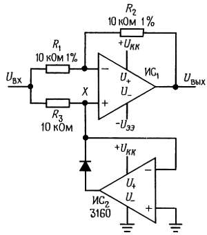 На рис. 4.46 показана еще одна схема определения абсолютного значения. Она представляет собой сочетание вспомогательного инвертора (ИС1) и активного ограничителя (ИС2). При положительных уровнях входного напряжения ограничитель не влияет на работу схемы, его выход находится в насыщении, и в результате ИСХ работает как инвертор с единичным коэффициентом усиления. Таким образом, выходное напряжение по абсолютному значению равно входному. При отрицательных уровнях входного напряжения ограничитель поддерживает в точке X напряжение, равное потенциалу земли, и при этом ИС1 работает как инвертор с единичным коэффициентом усиления. Таким образом, выходное напряжение равно абсолютной величине входного напряжения. Если ИС2 запитывается от единственного источника положительного напряжения, то отпадают проблемы, связанные с конечной скоростью нарастания, так как напряжение на выходе ограничителя изменяется лишь в пределах падения напряжения на диоде. Отметим, что от резистора R3 высокая точность не требуется.