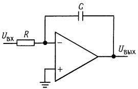 Входной ток Uвх/R протекает через конденсатор С. В связи с тем что инвертирующий вход имеет потенциальное заземление, выходное напряжение определяется следующим образом: