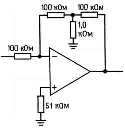 В схемах такого типа может потребоваться резистор обратной связи с очень большим сопротивлением. На рис. 4.49 показан прием, с помощью которого большое эффективное значение сопротивления обратной связи создается за счет резисторов с относительно небольшими сопротивлениями.