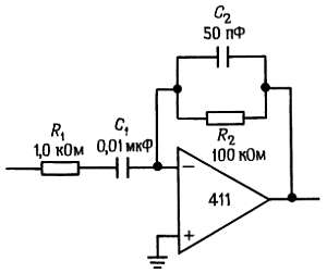 Компоненты R1 и С2, с помощью которых создается спад, выбирают с учетом уровня шума и ширины полосы пропускания ОУ. На высоких частотах благодаря резистору R1 и конденсатору С2 схема начинает работать как интегратор.