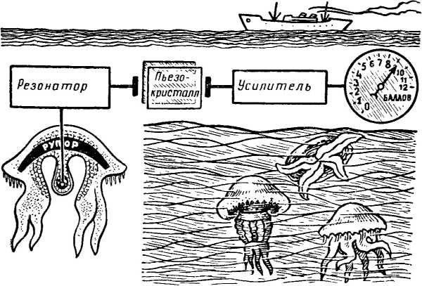 У медузы имеется стебелек, оканчивающийся шаром с жидкостью, в которой плавают камешки, опирающиеся на окончание нерва. Первой воспринимает «голос» шторма колба, наполненная жидкостью, затем через камешки этот голос передается нервам. В приборе, имитирующем орган слуха медузы (рис. 3), имеются рупор, резонатор, пропускающий колебания нужных частот, пьезодатчик, преобразующий эти колебания в импульсы электрического тока. Далее эти импульсы усиливаются и измеряются. Такой прибор позволяет определять наступление шторма за 15 часов.