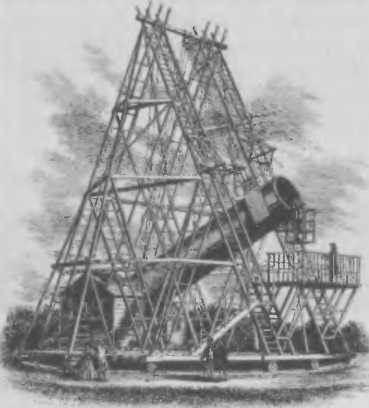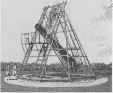 Вскоре Гершель взялся за постройку крупнейшего в мире рефлектора длиной 40 футов (12 м) с зеркалом диаметром 49,5 дюймов (126 см). Вместе с сыном Джоном и сестрой Каролиной он строил этот телескоп с 1785 по 1789 гг. В течение полувека, вплоть до 1845 г., «Великий 40–футовый» (Great Forty?Foot) оставался крупнейшим в мире. Его труба была железной, а вогнутое металлическое зеркало было сделано из спекулума (лат. speculum зеркало) — сплава % меди и олова с добавлением мышьяка. В ту эпоху зеркала всех рефлекторов делали из этого весьма твердого сплава, который, однако, хорошо полируется и отражает свет. Первое зеркало весило полтонны, но оказалось недостаточно прочным. Второе зеркало сделали вдвое толще; его в основном и использовали для наблюдений. Однако зеркала быстро тускнели, а переполиро- вывать их было очень сложно. Телескоп оказался громоздким и неудобным в рате. Наблюдения с этим великаном прекратились в 1815 г., а в 1840 г. его разобрали, поскольку деревянная монтировка подгнила и гигант мог рухнуть. Но некоторые части телескопа сохранились; главное зеркало находится в Музее науки в Лондоне.