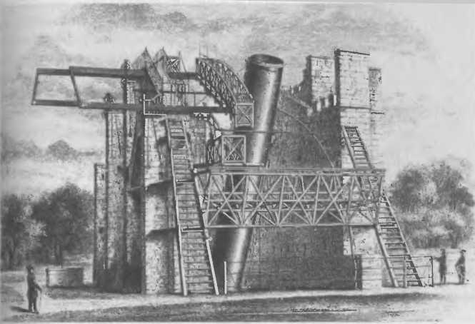 Рис. 2.4. «Великии 40–футовый» рефлектор В. Гершеля диаметром около 50 дюймов. Полстолетия он оставался крупнейшим в мире, но был неудобен в работе