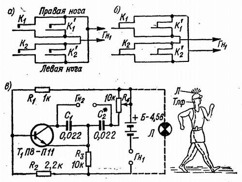 Для объективного судейства на соревнованиях по спортивной ходьбе параллельно с цепью звукового генератора можно сделать еще одну сигнальную цепь, состоящую из лампочки Лс для световой сигнализации о неправильных движениях. Такую лампочку можно укрепить на спине или шапочке спортсмена.