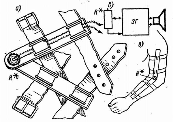 Для закрепления датчика на руке или ноге в планках, которые делаются или из тонких металлических полосок, или из пластмассы, нужно сделать по четыре прорези (попарно). В эти прорези продергиваются ремешки или широкие ленты, при помощи которых все подвижное устройство прикрепляется на суставах руки или ноги (впрочем, не исключается возможность укрепления в тазобедренном и плечевом суставах). На рис. 38, в показано прикрепление датчика для сигнализации о движениях в локтевом суставе.