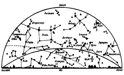 Созвездия, видимые в южной части горизонта в начале осени. Размеры кружков, изображающих звезды, соответствуют их блеску.