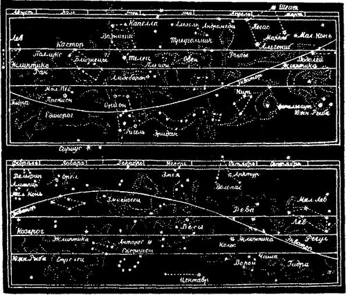После 22 июня Солнце уже не поднимается днем так высоко, оно как бы пятится назад, — поэтому, наверно, и соответствующий знак зодиака назван Раком. В августе Солнце находится в созвездии Девы, что соответствует уборке хлеба, в которой главная работа падала раньше на долю женщин. После уборки хлеба, в сентябре, определяли и взвешивали урожай. В результате появилось название знака Весов, в котором Солнце бывает в сентябре. Подобным же образом произошли, по-видимому, названия других знаков зодиака; например, Стрелец указывал, что в ноябре надо отправляться на охоту за зверем, Водолей указывал на предстоящие весенние разливы рек, знак Рыб отмечал время весеннего хода рыбы и надежд на богатый улов. В соответствии со знаками зодиака группы ярких звезд, находившихся поблизости от этих знаков, соединялись как бы в одно целое, в созвездия, к которым перешли имена знаков зодиака. Таким образом, появились двенадцать зодиакальных созвездий, из которых каждое обозначалось соответствующим знаком или рисунком. Знаки зодиака есть проявление древнейших астрономических знании. Их изображения можно найти высеченными из камня на гробницах, памятниках и других сооружениях. Найдены изображения знаков зодиака, сделанные древнейшими народами — египтянами, индусами, китайцами и ацтеками. Многие из рисунков имеют давность в две-три тысячи лет.