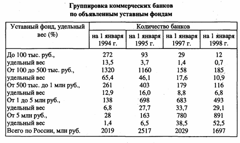 По правовой форме организации банки можно разделить на общества открытого и закрытого типов ограниченной ответственности. По экспертным оценкам, к концу 1995 г. в России в режиме закрытых форм работало примерно 60 % коммерческих банков. Разрешена также деятельность иностранных банков, а также банков с российским и иностранным совместным капиталом. На 1 сентября 1998 г. в России функционировали 145 кредитных организаций с иностранным участием в уставном капитале, получивших право на осуществление банковских операций.