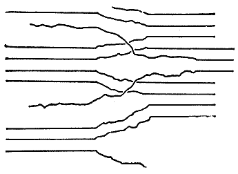 Целлюлозные цепочки всегда представляют собой простые нитевидные молекулы, которые не переплетаются с соседними нитями путем образования кислородных связей на боковых сторонах сахарных колец, как это делают другие более слабые полисахариды, например крахмал. Растительная клетка имеет форму трубки, стенки которой образованы длинными, уложенными приблизительно параллельно нитевидными молекулами целлюлозы. В природной целлюлозе имеются области, где молекулы-цепочки уложены идеально в параллельные пряди-кристаллы, они удерживаются в таком порядке с помощью гидроксильных связей по боковым сторонам молекул. Такие образования можно считать вполне добротными кристаллами с той удивительной особенностью, что они короче образующих их молекулярных цепочек (рис. 38). Каждый такой кристаллит заканчивается пучком распушенных цепочек, напоминающим по форме помазок для бритья, в котором волоконца уже не очень параллельны. Молекулы могут в дальнейшем вновь собраться в параллельный пучок и образовать новый кристаллит, так что одна молекула иногда тянется через несколько кристаллитов.