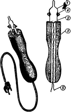 Рис. 71. Самодельный электровыжигатель: 1— нихромовая проволочка для выжигания; 2 — контактные держатели; 3 — рукоятка; 4 — зажимы; 5 — соединительные провода.