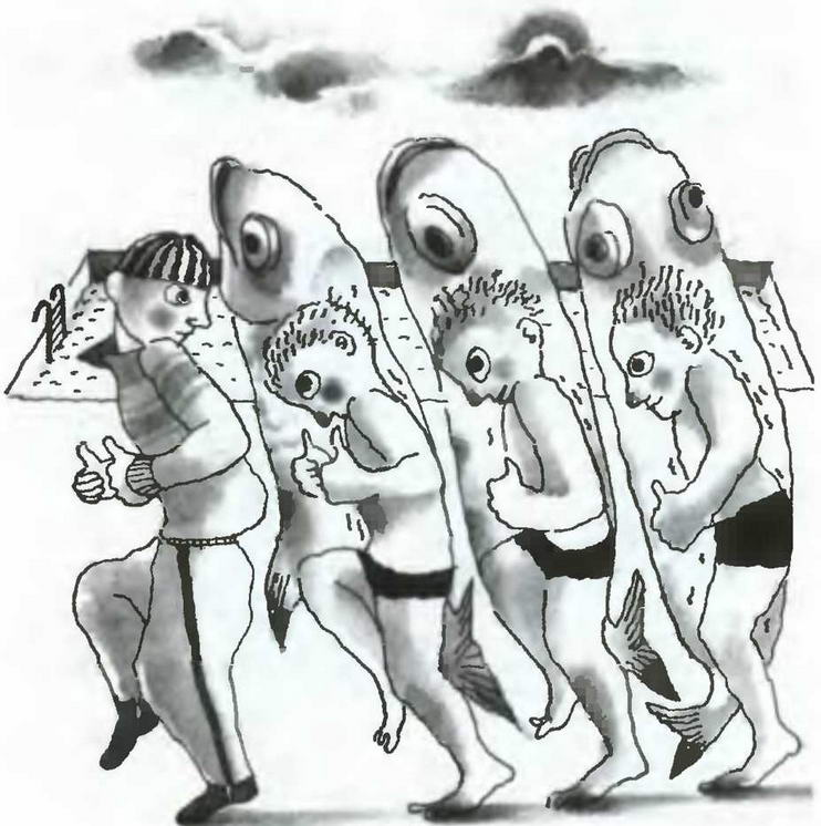 В общем, доплыл я и эти четыреста метров. Тело мое промерзло сантиметра на два в глубину по всей поверхности, как почва в осенней тундре. Тренер кричит: «Руками, руками работай!» Это значит — надо грести руками, а ноги пустить сзади, по воле волн, без дела. Я, правда, немного ими шевелю, а то утонут. Уж такая особенность у отдельных частей моего тела — они сами тонут и остальные за собой тянут. У акулы, читал, сходное положение: воздушного пузыря у нее нет, и, чтобы не утонуть, надо ей все время плавать, а для этого много и часто есть. Сейчас бы большую горячую котлету со сладким чаем! Мне меньше надо еды, чем акуле. Правда, я и плаваю медленнее. Кроме того, ей не надо поворачивать голову вбок, чтобы получить необходимую порцию воздуха. И что это я к акуле привязался?! Рыба как рыба.