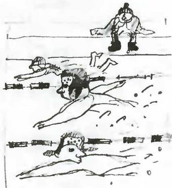 Все уже начали плавать на скорость — проплывали кролем пятьдесят метров в три четверти силы, как требовал тренер. Он объяснил, что у машины четыре скорости и у нас тоже. Надо включить третью из них и на ней проплыть пятьдесят метров. Просто и хорошо. Потом двадцать пять метров проплыть очень легко, отдыхая, примерно первой скоростью, а потом опять переходить на третью, и так двадцать раз. Я понял, что у меня из четырех скоростей была лишь одна первая, она же последняя, так что туг особенно и включать нечего.