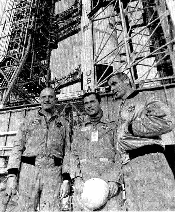 Рис. 6.18. Экипаж «Аполлона-10»: Т. Стаффорд, Д. Янг, Ю. Сернан (слева направо) на фоне стартового комплекса.