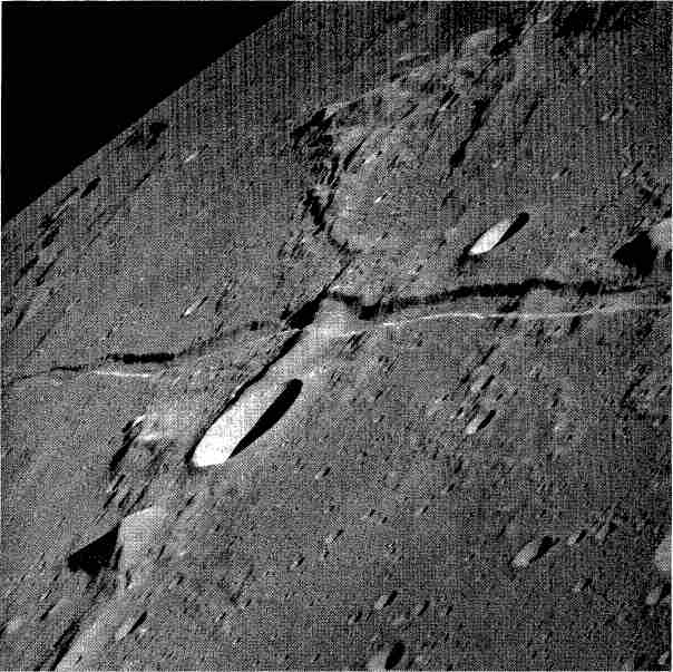Рис. 6.19. Луна полна загадок. Геологи не знают, как образовались на ее поверхности узкие борозды длиной в десятки и даже сотни километров. Они бывают извилистыми, дугообразными и прямолинейными, как показанная здесь борозда Ariadaeus Rille длиной более 300 км и шириной 3–5 км, расположенная на 7° с. ш. и 13° в. д. Но фото, сделанном экипажем «Аполлона-10» с высоты 14 км (объектив с фокусом 250 мм), виден ее участок длиной 120 км.