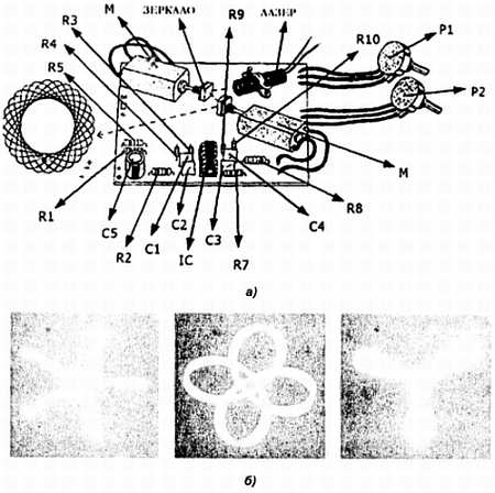 На валах двигателей закреплены небольшие зеркальца. Плоскость зеркал составляет небольшой угол с плоскостью перпендикулярной осям двигателей. Луч лазера попадает на первое зеркальце под определенным углом к оси двигателя, на некотором расстоянии от центра вращения, и, отражаясь от него, аналогично попадает на второе зеркальце. При вращении двигателей выходящий из устройства луч регулярно описывает в пространстве достаточно причудливую траекторию. Вид узоров, возникающих на стенах, потолке и в окружающем воздухе (при наличии в нем рассеивателей, например, пыли или дыма), зависит от настройки системы (рис. 140, б).