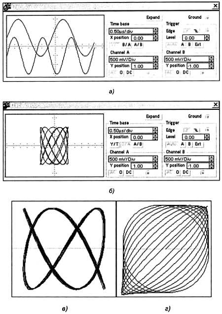 Изменяя значения частоты вращения двигателей потенциометрами Р1 и Р2, можно наблюдать различные картины колебаний (рис. 143, в, г), которые показаны на экране осциллоскопа, переключенного в режим Expand.