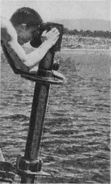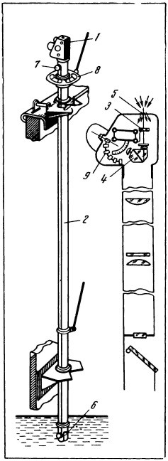 Прибор ФМ-46 представляет собой визуальный фотометр, в котором сравниваются яркости двух фотометрических полей. Одно из них создается светом, выходящим из толщи моря (по данному выбранному направлению), а другое — естественным светом Солнца и небосвода, освещающим пластинку молочного стекла 5 на фотометрической головке прибора 1. Фотометрическая головка прибора снабжена трубой 2, нижний конец которой на 10–15 см погружен под воду. Для наблюдения толщи моря в заданном направлении на нижнем конце трубы укреплено визирное зеркало 6, которое можно наклонять рукояткой 7 (меняя угол с вертикалью) и поворачивать штурвалом 8 (меняя азимут). Шесть цветных светофильтров 9, установленных в приборе, позволяют измерять спектральный состав выходящего из толщи моря излучения. Яркости фотометрических полей уравниваются путем перемещения молочного стекла 3, находящегося между фотометрической призмой 4 и приемным стеклом 5. Сама труба состоит из трех секций, ее общая длина (в зависимости от высоты борта судна) может быть либо 3,5, либо 6 м. В комплект прибора входит также специальное приспособление для крепления его к борту судна. Наблюдения проводятся с борта судна, освещенного Солнцем. Для измерений требуется почти штилевая погода, и при волнении выше двух баллов наблюдения должны прекращаться. Измеряя коэффициенты яркости моря, необходимо следить за облачностью и фиксировать высоту Солнца.