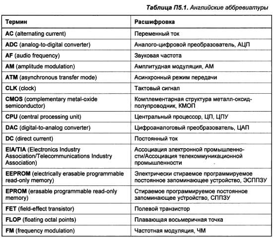 Разработчики электронных приборов — большие любители сокращений, которые нередко приводят без дополнительных пояснений. Некоторые из часто встречающихся английских аббревиатур расшифровываются в табл. П5.1.