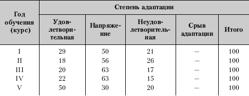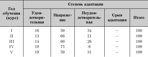 Оказалось, что успешнее всех адаптировались в первые три месяца учебы в вузе выпускники училищ и школьники-медалисты. Наиболее высокий уровень дезадаптации отмечен у студентов, зачисленных на I курс со стажем работы на производстве (75–85 %).
