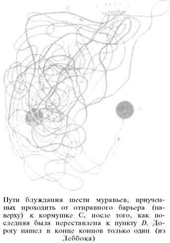 Те же насекомые, с геометрической точностью строящие стенки сотов под вечно равными друг другу углами или устраивающие коллективные «коровники» из травяных тлей при своих муравейниках, будучи поставлены в чуть-чуть непредвиденные условия, мгновенно теряются до полного расстройства координации. Если десяток муравьев как будто бы дружно волокут к муравейнику соломинку, то это изумляет и поражает, однако более тщательная проверка показывает, что при этом шестеро муравьев тянут в сторону гнезда, а остальные четыре — прочь от него, и соломинка влечется только по равнодействующей.