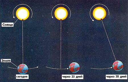 Если пятно, на которое мы смотрим, расположено примерно в середине солнечного диска, то оно совершит полный оборот вокруг Солнца за 25 дней. Но только через 28 дней мы увидим его опять в середине диска, так как Земля за это время переместится по своей орбите.