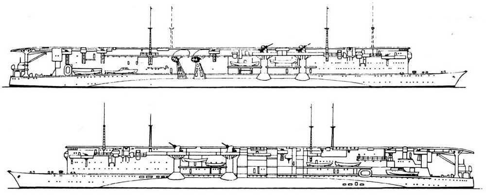 На проект переоборудования «Акаги» в авианосец оказал большое влияние английский «Фьюриес». Первоначально японский корабль имел схожую конструкцию: сплошная полетная палуба размером 190,2 х 30,5 м занимала примерно 3/4 длины корпуса, ангар был двухъярусным, и впереди каждого яруса располагались площадки для старта самолетов непосредственно из ангара. Нижняя площадка длиной 55 м предназначалась для взлета бомбардировщиков и торпедоносцев, над ней располагалась вторая, длиной всего 15 м, приспособленная для старта более легких самолетов - истребителей и разведчиков. Верхняя палуба имела уклон в корму в 1,5° и служила преимущественно для посадки самолетов.