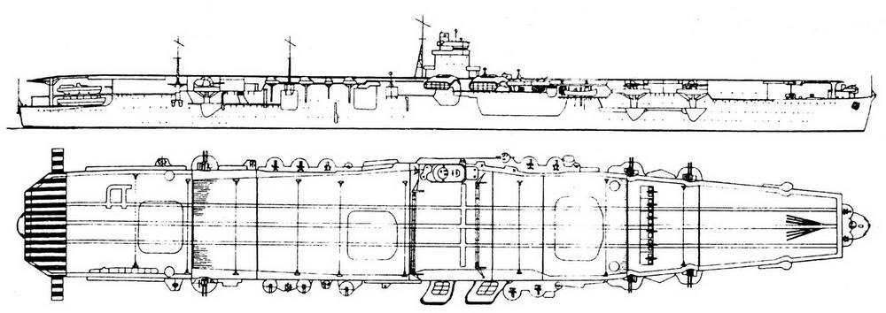«Рюдзё» (Ryujo) Йоко 26.11.1929/2.4.1931/9.5.1933 — погиб 24.8.1942Построен по программе 1927 г. Малые размеры корабля определялись лимитом тоннажа, отведенным на авианосцы Вашингтонским соглашением. Хотя реальное водоизмещение «Рюдзё» заметно превышало официально декларируемое (8000 т), его боевые возможности оставались весьма ограниченными.