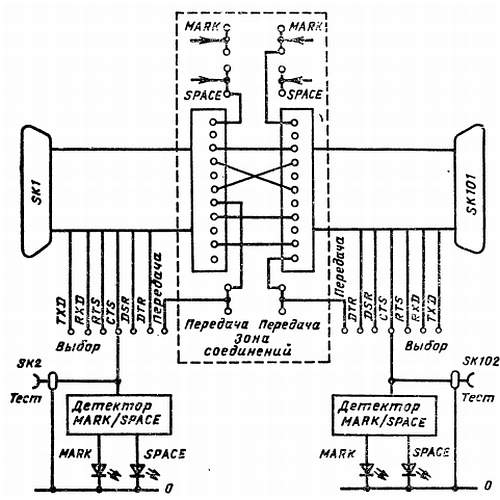 Шесть наиболее важных сигнальных линий (TXD, RXD, RTS, CTS, DSR и DTR) с каждой стороны интерфейса подаются на выбирающий переключатель. Выход переключателя связан со схемой обнаружения МАRК/SPACE, а также с разъемом ввода-вывода для внешнего контрольно-измерительного прибора. Седьмое положение переключателя используется только по мере необходимости для передачи остальных сигналов из зоны соединений в схему обнаружения MARK/SPACE.