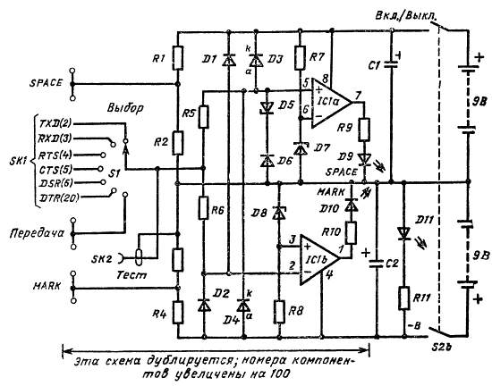 Сигналы из зоны соединений выбираются с помощью переключателей S1 и S101. Микросхемы IC1a и IC1b действуют как компараторы; на их выходах образуются высокие уровни, когда входное напряжение больше +3 В или меньше —3 В соответственно. Диоды D1—D4 обеспечивают защиту от входных напряжений, превышающих положительное и отрицательное максимальное напряжения питания (максимальное напряжение в интерфейсе RS-232C равно ±25 В). Стабилитроны D7 и D8 образуют эталонные напряжения для компараторов, т. е. минимальное напряжение для SPACE и максимальное напряжение для MARK. С помощью D5 и D6 преодолевается ограничение используемого операционного усилителя, когда входное напряжение близко к отрицательному напряжению питания. Питание схемы обеспечивают две сухие батареи по 9 В каждая, а светодиод D11 сигнализирует о включенном питании.