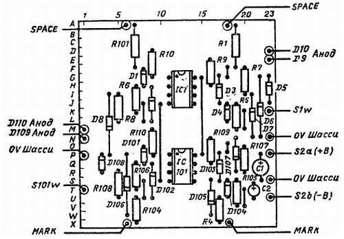 Вставьте две новые батареи типа РРЗ и включите устройство, о наличии питания должен сигнализировать светодиод D11. Переключатели S1 и S101 должны находиться при этом в положении Передача; оба светодиода MARK и SPACE светиться не должны. Поочередно подайте в гнезда Передача с каждой стороны зоны соединений сигналы от гнезд MARK и SPACE. При этом должен, светиться соответствующий светодиод; если он не светится, тщательно проверьте монтаж, включая и соединения с печатной платой.