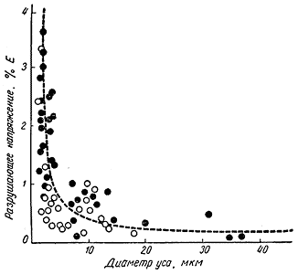 Рис. 24. Зависимость прочности усов от их толщины. Белый кружок - усы кремния; черный - усы окиси цинка.