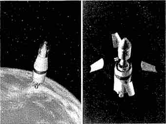 Рис. 6.13. Последняя ступень ракеты «Сатурн-5» с кораблем «Аполлон». Слева: в верхней части виден командно — служебный модуль, а лунный модуль скрыт корпусом ракеты. Справа: створки переходника отстрелились, освободив CSM и обнажив LM.