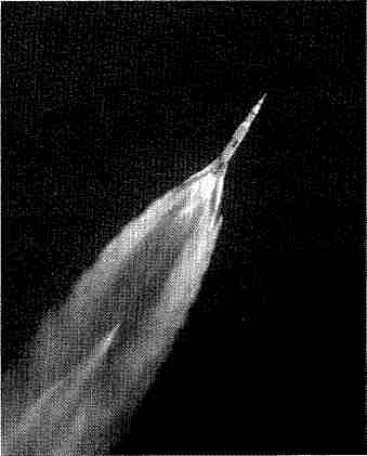 Рис. 6.12. Ракета «Сатурн-5» в стратосфере, на высоте 63 км, за несколько секунд до отстыковки первой ступени (середина 3–й минуты полета). Фото сделано с борта самолета длиннофокусным объективом.