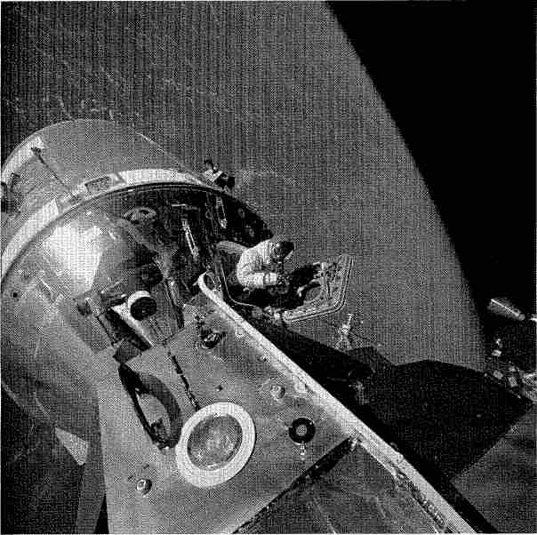 Рис. 6.14. «Вот это вид!» Дэйвид Скотт в обрезе люка командного модуля «Аполлона-9». Фото Рассела Швейкарта.