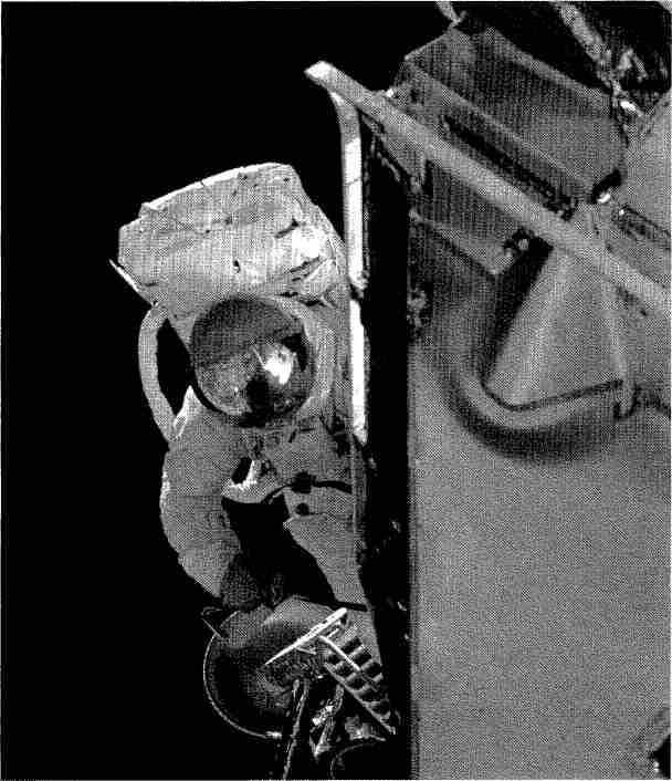 Рис. 6.15. Р. Швейкарт испытывает лунный скафандр с системой жизнеобеспечения на внешней поверхности лунного модуля «Аполлона-9».