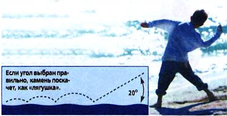 ФИЗИКА «БЛИНЧИКОВ». Еще один феномен, связанный с водой, заключается в том, что плоский камешек, брошенный под углом к водной поверхности, прыгает, словно лягушка. Американские физики потратили около года, чтобы выяснить, что больше всего отскоков будет, если плоский камень пустить под углом 20 градусов к поверхности воды. Теперь на основании этого открытия они надеются побить рекорд, зафиксированный в Книге рекордов Гиннесса — 38 отскоков.