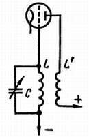 Здесь анодный ток разветвляется на два направления: переменная составляющая через конденсатор С подводится к колебательному контуру, а постоянная составляющая проходит к положительному полюсу анодного напряжения через ВЧ дроссель. Так называют катушку, индуктивное сопротивление которой препятствует прохождению токов ВЧ. По пути к катоду лампы переменная составляющая анодного тока проходит по части катушки колебательного контура; катушка снабжена специальным выводом. Переменная составляющая наводит в контуре напряжение, достаточное для генерирования колебаний.