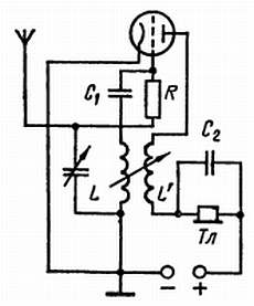 Самое важное заключалось в наличии в анодной цепи катушки L' соединенной последовательно с телефоном. Эта катушка имела регулируемую связь с катушкой L сеточного колебательного контура. Для этой цели катушка обратной связи устанавливалась на подвижном основании, позволявшем приближать ее к неподвижной катушке L. Такая конструкция давала возможность устанавливать максимальную обратную связь, обеспечивая большое усиление и высокую избирательность. Таким образом радиолюбители могли принимать очень удаленные передатчики.