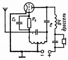 Трехточечная схема может также применяться в приемнике с регенеративным детектором. Для этой цели в цепь сетки включают резистор R1, зашунтированный конденсатором С1 (рис. 89).