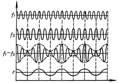 Рис. 90. Наложение двух колебаний с частотами f1 и f2 образует сложное колебание с частотой f1 — f2, которое при детектировании дает колебание с частотой F, равной разности частот двух составляющих.