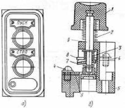 а – вид спереди, б – устройство (продольный разрез); 1 – кнопочный элемент («Пуск» – чёрного цвета, «Стоп» – красного цвета), 2, 3 – пружина, 4 – винтовые зажимы; 5 – основание, 6 – неподвижный замыкающий контакт, 7 – мостиковый контакт, 8 – неподвижный контакт.