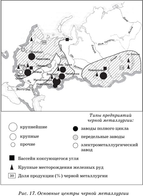Это старейший металлургический район России, и его собственные сырьевые и топливные ресурсы в значительной степени исчерпаны. Поэтому большая часть сырья сейчас привозится из Кузбасса и Казахстана. Большая часть металла выплавляется на комбинатах-гигантах в Магнитогорске, Нижнем Тагиле, Челябинске и Новотроицке (рис. 17).